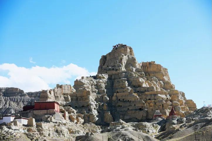 古格王國遺址在阿里地區(qū)札達縣托林鎮(zhèn)札布讓村兩公里外的一座土山上,海拔高度為3680米,占地面積72萬平方米。遺址現(xiàn)存遺跡群有房(殿)址445間、窯洞(石窟)880孔、碉堡58座、佛塔28座等。