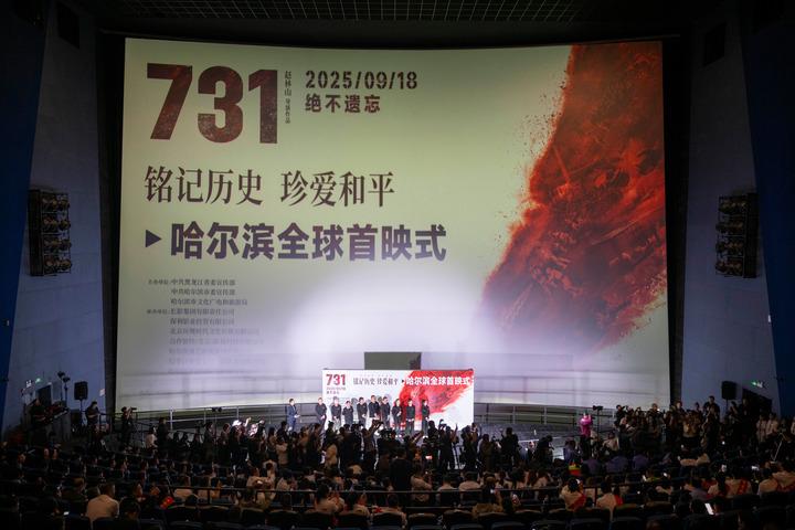 這是2025年9月17日在哈爾濱市哈東萬達影城拍攝的《731》全球首映儀式現(xiàn)場。新華社記者 張濤 攝