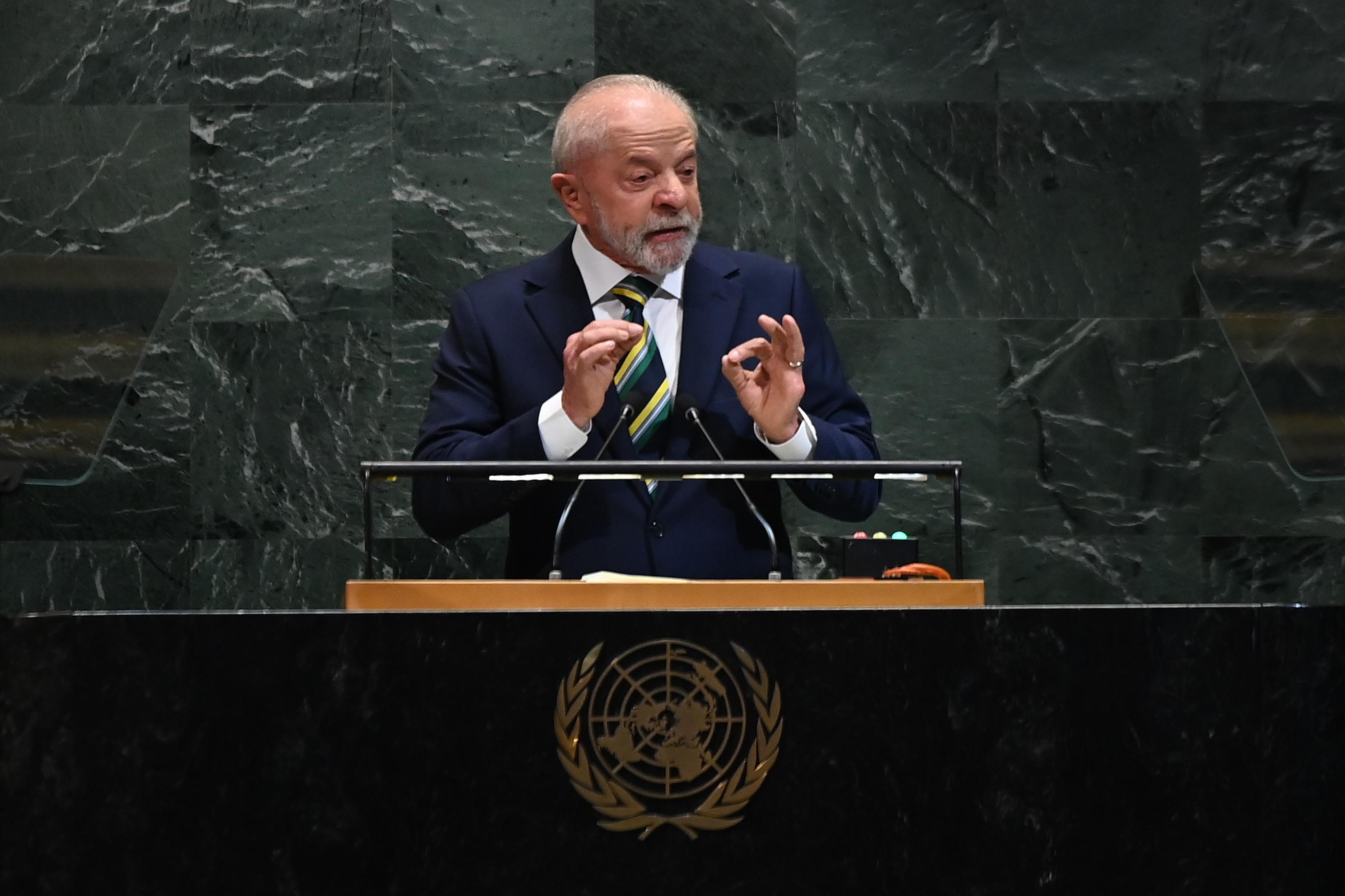 9月23日,在位于紐約的聯(lián)合國總部,巴西總統(tǒng)盧拉出席第80屆聯(lián)合國大會一般性辯論時發(fā)表講話,強調(diào)國際社會應(yīng)捍衛(wèi)多邊主義和民主制度、反對單邊制裁和干涉主權(quán)國家,并呼吁維護拉美地區(qū)和平。新華社記者李睿攝
