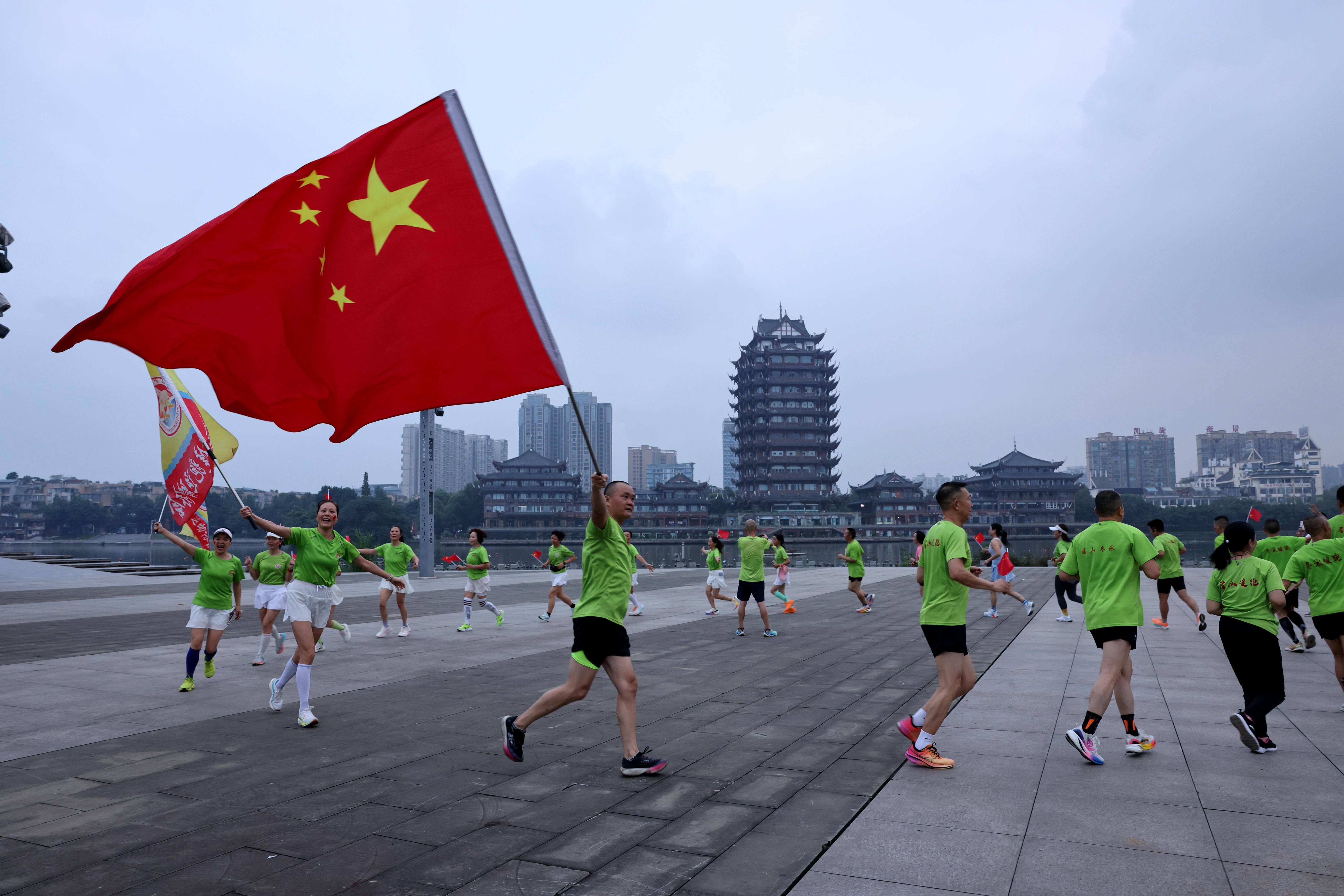 10月1日,在四川省眉山市東坡城市濕地公園,健跑愛好者參加慶祝祖國華誕的“10.01公里”長跑活動。