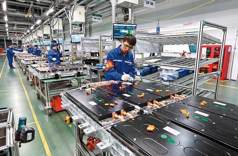△工人在安裝新能源汽車動力電池系統(tǒng)。