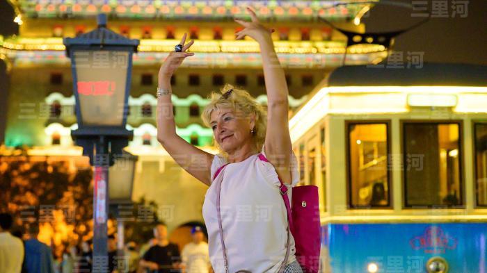 2025年9月10日,北京前門大街,外國(guó)游客感受古都夜韻。