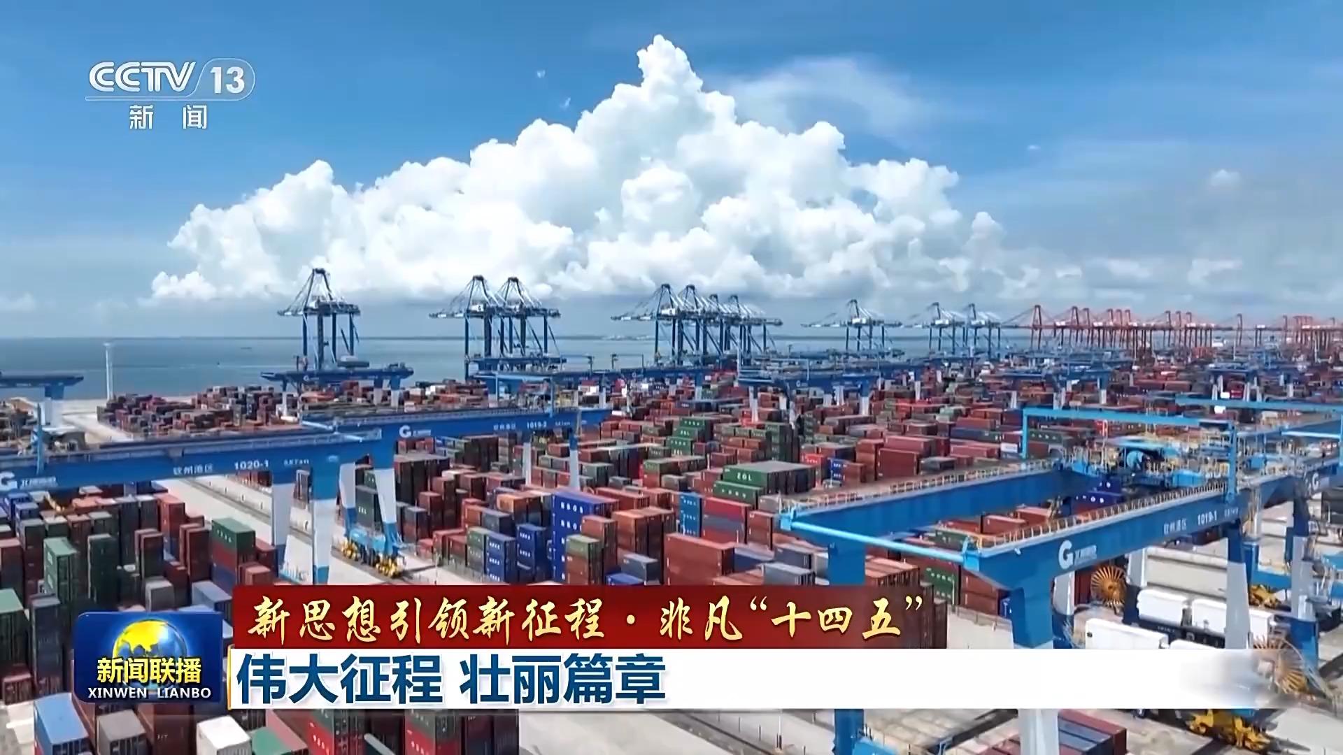 這是欣欣向榮的奮進(jìn)中國。五年經(jīng)濟(jì)增量預(yù)計(jì)超過35萬億元,高于世界排名第三國家的經(jīng)濟(jì)總量。對(duì)世界經(jīng)濟(jì)增長的貢獻(xiàn)率保持在30%左右;貨物貿(mào)易規(guī)模較"十三五"末增長了32.4%,連續(xù)8年穩(wěn)居全球第一。