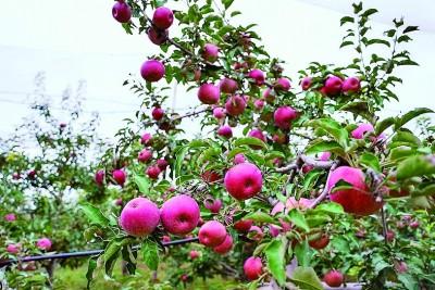 走進(jìn)小城子鎮(zhèn)的蘋(píng)果園,紅彤彤的蘋(píng)果綴滿枝頭。