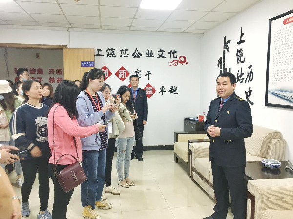 上饒站黨總支書(shū)記陳衛(wèi)紅向記者介紹火車站。圖片來(lái)源:中國(guó)鐵路南昌局集團(tuán)有限公司 陳衛(wèi)紅說(shuō),“2014年第五代高鐵站房啟用后,上饒正式邁入了高鐵時(shí)代。從上饒坐高鐵到上海只要2小時(shí)50分鐘,時(shí)速350公里,這種速度剛參加工作的時(shí)候我想都不敢想。” 如今,上饒火車站已成為上饒市熱門(mén)網(wǎng)紅打卡地,車站外形象一艘揚(yáng)帆起航的船,站內(nèi)的設(shè)備設(shè)施也更加完善,和諧號(hào)動(dòng)車已經(jīng)在車站???,許多市民都相約到車站或一睹動(dòng)車風(fēng)采或興奮地乘坐動(dòng)車出行。