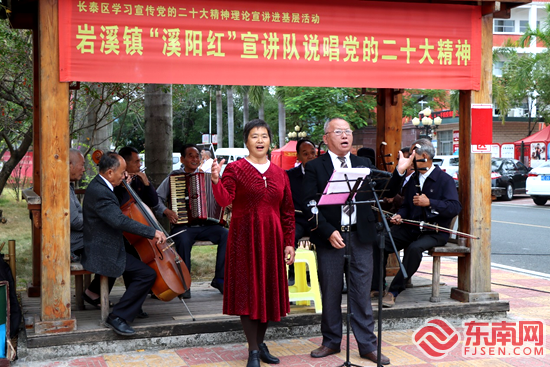 “共產(chǎn)黨為人民,得民心,二十大描繪美好的前程……”長泰區(qū)珪后村鄉(xiāng)村公園里,一支由村里老人組成的“溪陽紅”宣講隊格外引人注目,他們把黨的二十大報告金句串聯(lián)起來,用閩南方言以說唱的形式向村里群眾宣講,濃濃的鄉(xiāng)音格外接地氣,圍觀群眾紛紛叫好。 黨的二十大閉幕后,漳州市長泰區(qū)迅速從各地各單位抽調(diào)骨干,成立11支理論宣講小分隊。11月2日上午,長泰區(qū)在巖溪鎮(zhèn)珪后村啟動“學習宣傳黨的二十大精神理論宣講進基層活動”,區(qū)委常委、宣傳部部長陳貴芬向全區(qū)9個鄉(xiāng)鎮(zhèn)(場、區(qū)、辦事處)、區(qū)直機關(guān)黨工委、教育局組成的宣講小分隊授旗。區(qū)委黨校教師作了題為《團結(jié)奮發(fā)繪宏圖 百年圓夢譜新篇——深入學習貫徹中國共產(chǎn)黨第二十次全國代表大會精神》專題輔導報告。
