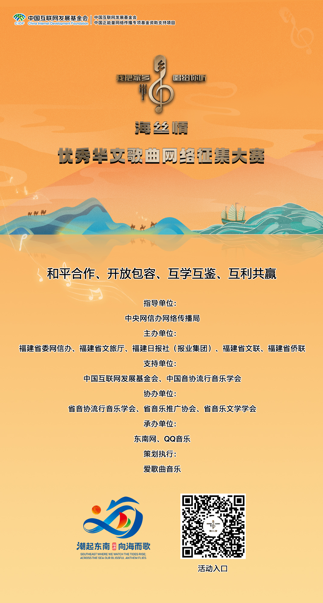 傳承絲路精神,弘揚(yáng)絲路文化。 近日,“海絲情·我把家鄉(xiāng)唱給你聽(tīng)”優(yōu)秀華文歌曲網(wǎng)絡(luò)征集大賽正式啟動(dòng)后,迅速成為音樂(lè)界的熱門話題,許多音樂(lè)人紛紛發(fā)來(lái)作品參賽。今天起,賽事將進(jìn)入展播階段,組委會(huì)將在參賽作品中挑選優(yōu)秀作品,在東南網(wǎng)、海峽網(wǎng)等多個(gè)官方平臺(tái)進(jìn)行展播,并在抖音、視頻號(hào)、QQ音樂(lè)等平臺(tái),用媒體官方號(hào)、組委會(huì)官方號(hào)全方位推送展示。 為了能讓自己的參賽作品順利進(jìn)入展播歌曲大名單,參賽者要認(rèn)真填寫(xiě)報(bào)名表,有歌曲視頻MV的展播優(yōu)先。 “海絲情·我把家鄉(xiāng)唱給你聽(tīng)”優(yōu)秀華文歌曲網(wǎng)絡(luò)征集大賽,由中央網(wǎng)信辦網(wǎng)絡(luò)傳播局指導(dǎo),福建省委網(wǎng)信辦、福建省文旅廳、福建日?qǐng)?bào)社(報(bào)業(yè)集團(tuán))、福建省文聯(lián)、福建省僑聯(lián)等主辦?;顒?dòng)得到了中國(guó)互聯(lián)網(wǎng)發(fā)展基金會(huì)中國(guó)正能量網(wǎng)絡(luò)傳播專項(xiàng)基金資助支持。
