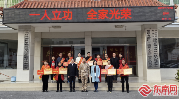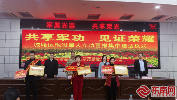 送喜報(bào) 東南網(wǎng)1月17日訊(通訊員 曾德喜 李琳 文/圖)1月16日,莆田市城廂區(qū)舉辦為榮立個(gè)人三等功的7名現(xiàn)役軍人家庭集中送喜報(bào)儀式,讓軍人軍屬共享榮光和喜悅。城廂區(qū)委常委、區(qū)人武部政委葛富裕,城廂區(qū)政府副區(qū)長肖嫻等出席。 現(xiàn)場,軍人家屬們笑容滿面,胸前佩戴著鮮紅的“一人立功,全家光榮”綬帶,等待著這一榮耀時(shí)刻的到來。隨著全體人員奏唱中華人民共和國國歌,現(xiàn)場氣氛達(dá)到了高潮。奏唱完畢后,城廂區(qū)退役軍人事務(wù)局局長、區(qū)雙擁辦主任林清華宣讀部隊(duì)立功受獎人員名單,與會領(lǐng)導(dǎo)為榮立三等功的7名現(xiàn)役軍人家屬代表送上喜報(bào)和慰問金,并向他們表示熱烈祝賀。