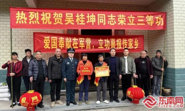 送喜報 東南網(wǎng)2月12日訊(通訊員 田禧娜 文/圖)為弘揚擁軍優(yōu)屬光榮傳統(tǒng),營造良好的社會風尚,2月10日,莆田市城廂區(qū)退役軍人事務局、城廂區(qū)人武部、常太鎮(zhèn)退役軍人服務站等組成送喜報小隊,向常太鎮(zhèn)溪南村、過溪村榮立“三等功”現(xiàn)役軍人劉昱洲、吳桂坤家庭送去立功喜報,并為軍屬佩戴綬帶,送上慰問金。