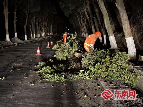 永春分中心一線養(yǎng)路工夜間處理倒伏路樹。泉州市公路中心 供圖