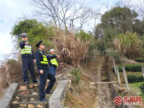 聯(lián)合檢查組查看邊坡排水溝。寧德高速執(zhí)法支隊供圖