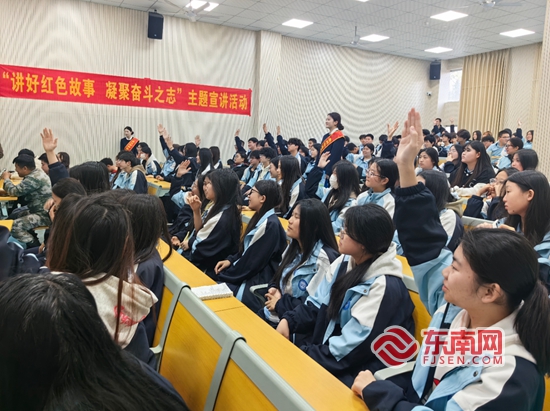 紅色問題提問環(huán)節(jié),學(xué)生們踴躍舉手回答問題。謝吉柳 供圖 由中共泉州市委市直機(jī)關(guān)工作委員會、中共泉州市委黨史和地方志研究室、中共泉州市委講師團(tuán)、泉州市退役軍人事務(wù)局聯(lián)合主辦,中共惠安縣委縣直機(jī)關(guān)工作委員會、中共惠安縣委黨史和地方志研究室、惠安縣退役軍人事務(wù)局、惠安縣人力資源和社會保障局、泉州市云揚(yáng)航空職業(yè)技術(shù)學(xué)校共同承辦的“講好紅色故事 凝聚奮斗之志”主題宣講活動在泉州市云揚(yáng)航空職業(yè)技術(shù)學(xué)校舉行?;顒油ㄟ^贈書、紅色故事宣講、紅色知識問答、參觀黨史教育基地等形式,為師生們帶來了一場紅色精神的洗禮。