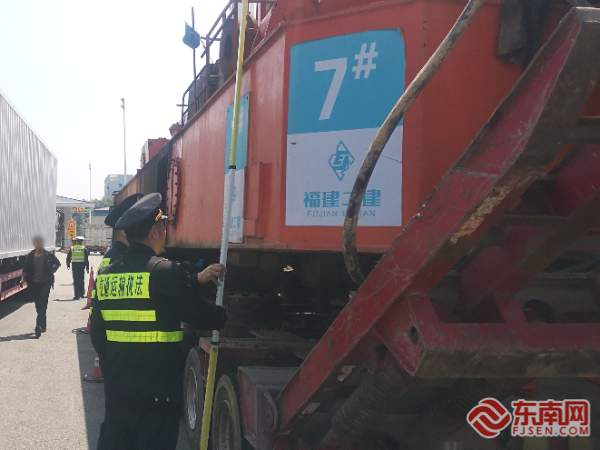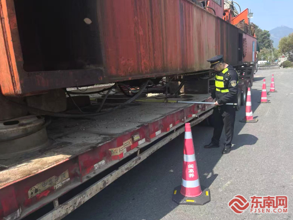 執(zhí)法人員對大件運輸貨物進行測量 此次運輸22米長路基箱的貨車抵達賽岐高速入口時,執(zhí)法人員立即啟動標準化核驗程序。賽岐中隊采用傳統(tǒng)皮尺丈量與現(xiàn)代數(shù)據(jù)復核結合方式,兩名執(zhí)法員運用“米”字形交叉測量法,對車體及貨物外廓的9項數(shù)據(jù)逐項比對,誤差嚴格控制在±3厘米內(nèi)。針對該車特殊裝載情況,實施“雙人雙簽”機制,測量人員獨立記錄并簽字確認,核驗達標后即時通報聯(lián)動部門,為后續(xù)運輸路線的安全護航提供了堅實保障。