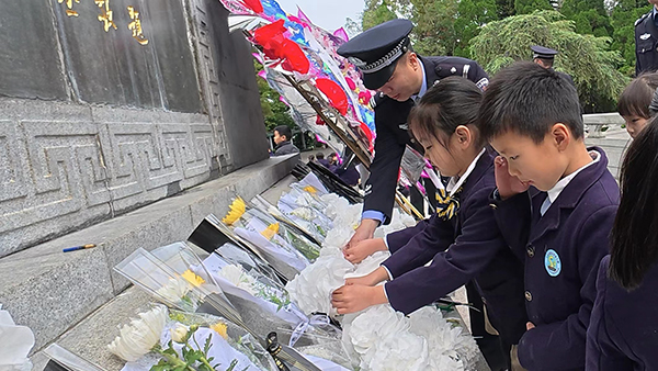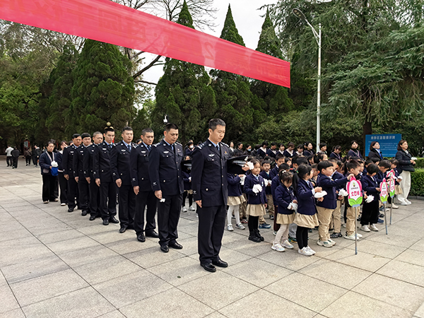 警民同心傳薪火 在巍峨的革命烈士紀(jì)念碑前,民警與師生們整齊列隊。當(dāng)《義勇軍進(jìn)行曲》響起,警徽在陽光下閃耀,民警與教師代表共同敬獻(xiàn)花籃,紅綢挽帶上“革命先烈永垂不朽”的金色大字,見證著跨時空的敬意。