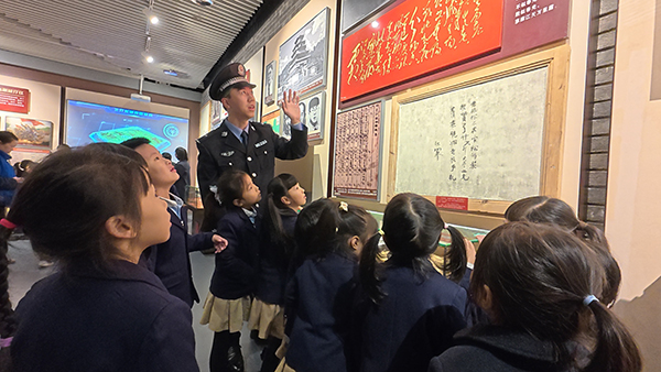 民警代表陳文捷在致辭中深情說道:“紅軍戰(zhàn)士吹響沖鋒號時,他們最小的就比你們大七八歲,正是無數(shù)這樣的青春熱血,換來了我們今天的幸福生活?!卑殡S著民警的引導(dǎo),孩子們將手中的白花輕輕放到紀(jì)念碑基座上,這一刻,稚嫩的小手與堅定的警徽共同守護(hù)著紅色記憶。 攜手觸摸歷史溫度 在革命歷史紀(jì)念館內(nèi),玻璃展柜里泛黃的信件和舊書吸引了孩子們的目光,民警們擔(dān)任起了“臨時講解員”。