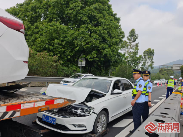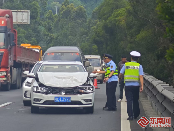 事故現(xiàn)場。寧德高速行政執(zhí)法支隊供圖 事故發(fā)生后,大隊立即啟動聯(lián)勤預案,聯(lián)合高速交警、路勤中心趕赴現(xiàn)場。執(zhí)法人員迅速在事故后方布設警示標志,通過擴音器引導后方車輛減速避讓,并協(xié)同交警對現(xiàn)場實施臨時交通管制,有效防止二次事故發(fā)生。經(jīng)勘查,事故系車流密集路段車輛跟車距離不足所致,未造成人員傷亡。在多部門協(xié)同下,事故車輛被快速拖離至就近的福安下白石出口進行后續(xù)處理,10分鐘內(nèi)路面通行秩序全面恢復。