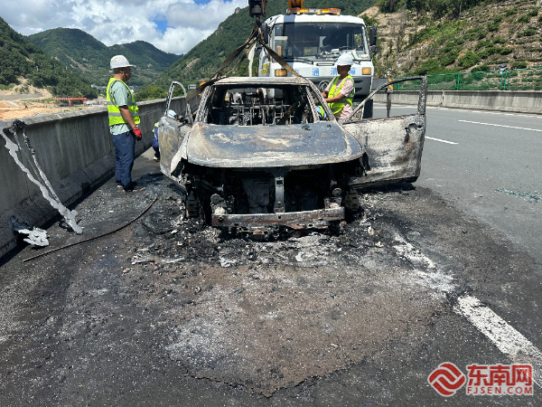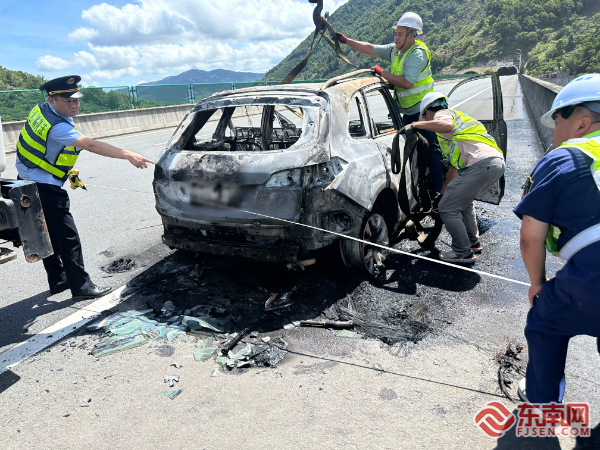 事故救援現(xiàn)場(chǎng)。寧德高速執(zhí)法支隊(duì)供圖 事故現(xiàn)場(chǎng)濃煙彌漫,燃燒車(chē)輛占據(jù)主車(chē)道及應(yīng)急車(chē)道,嚴(yán)重威脅通行安全。執(zhí)法人員立即設(shè)置安全警示區(qū)并擺放反光錐筒,聯(lián)動(dòng)高速交警、路勤中心協(xié)同處置。經(jīng)確認(rèn),車(chē)內(nèi)4名司乘人員(含兒童)已全部安全轉(zhuǎn)移至護(hù)欄外,未造成人員傷亡。14時(shí)整,福鼎市消防救援大隊(duì)3輛消防車(chē)到達(dá)現(xiàn)場(chǎng),經(jīng)30分鐘專(zhuān)業(yè)撲救完全撲滅明火。執(zhí)法人員同步完成路產(chǎn)勘驗(yàn),配合清障部門(mén)快速拖離事故車(chē)輛,于14時(shí)30分全面恢復(fù)道路通行。