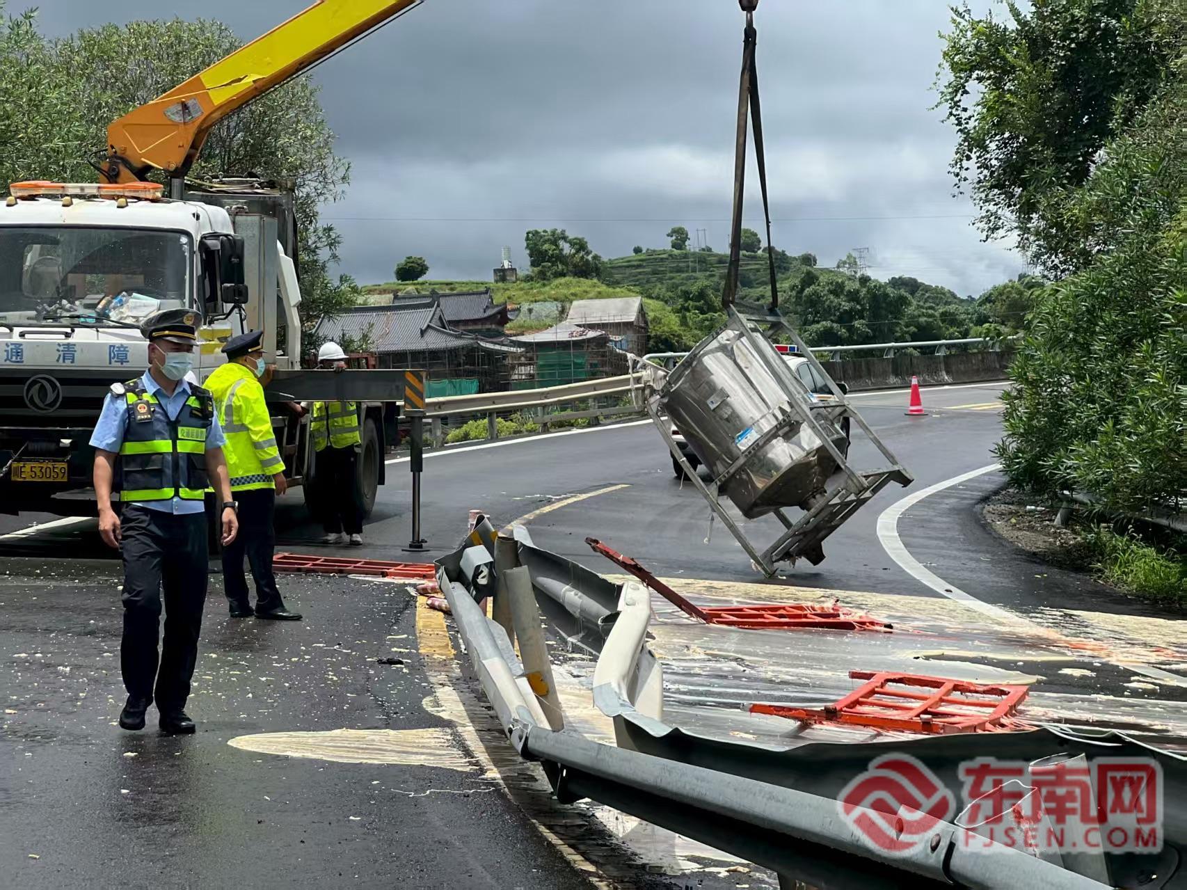 散落危化品陸續(xù)調(diào)離 接警后,寧德高速執(zhí)法支隊(duì)立即啟動應(yīng)急預(yù)案,迅速聯(lián)動消防、高速交警等相關(guān)部門火速趕赴現(xiàn)場。執(zhí)法人員抵達(dá)后發(fā)現(xiàn),一輛運(yùn)載20噸聚氨酯樹脂的貨車所載貨物散落路面,部分桶體破損導(dǎo)致聚氨酯樹脂大量泄漏。粘稠刺鼻的樹脂堆積在車道內(nèi),造成路產(chǎn)損壞,現(xiàn)場彌漫濃烈異味,存在安全與環(huán)境污染雙重風(fēng)險。事故車輛占據(jù)匝道,嚴(yán)重影響通行安全,駕駛員因貨物損失及險情情緒十分激動。