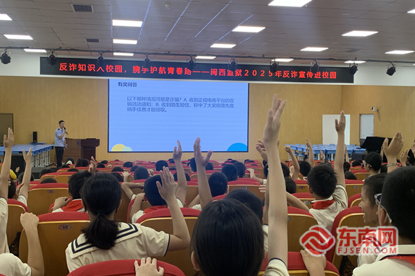在閩西監(jiān)獄民警進校園開展法治宣傳教育活動中,孩子們踴躍參與其中,積極和民警互動 在龍巖二中,退役軍人、閩西監(jiān)獄六分監(jiān)獄民警陳玉文以“鑄強國魂,立報國志”為主題,為千余名師生作國防教育宣講。他從《中華人民共和國國防法》切入,系統(tǒng)介紹中國武裝力量結(jié)構(gòu)和各軍種職能,更以親身經(jīng)歷的軍旅生活,拉近青少年與大國國防的距離。他從“海上守護戰(zhàn)機起降”到“高墻內(nèi)守護社會底線”的崗位轉(zhuǎn)變,生動詮釋了軍人與警察兩重使命背后的同一份忠誠。 在松濤小學,閩西監(jiān)獄四分監(jiān)區(qū)民警以“平安進校園,安全我護航”為主題,為四年級學生帶來一堂實用的法治安全課。圍繞交通安全、用火用電、食品安全等內(nèi)容,民警通過交通標志競猜、視頻案例剖析等形式,增強學生自我保護意識。結(jié)合未成年人保護相關(guān)法律,他們還將“游戲皮膚詐騙”“追星打賞騙局”等熱點問題轉(zhuǎn)化為通俗易懂的案例,引導學生知法守法、遠離陷阱。