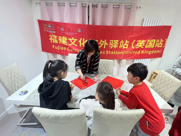 “清新福建下午茶”主視覺畫面 活動現(xiàn)場展播了《福建見?!贰陡=ㄈ缒恪贰陡=?分鐘》等福建宣傳短片,展現(xiàn)了“清新福建”和中國傳統(tǒng)“福”文化。驛站工作人員還邀請英國友人及華僑華人一同寫“福”字、寫春聯(lián)、品嘗福建茗茶等,營造了祥和喜慶的中國春節(jié)氛圍。