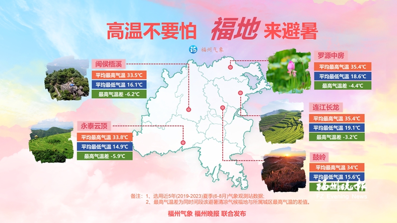 有山 五大避暑清涼福地 在2024年福州避暑地圖上,鼓嶺、永泰縣云頂景區(qū)、羅源縣中房鎮(zhèn)、閩侯縣洋里鄉(xiāng)梧溪村、連江縣長龍鎮(zhèn)在列。 鼓嶺,是不少福州人的避暑首選。24日,記者自駕來到鼓嶺旅游度假區(qū)的長田花溪谷,只見朵朵嬌艷的繡球花綻放,讓人宛如來到了“莫奈的花園”。“我是福州人,基本每年都來鼓嶺避暑,鼓嶺的涼快是出了名的。這里拍照不熱,感覺像是來到天然的空調(diào)房?!睌z影愛好者鄧先生告訴記者。 鼓嶺距市中心約12公里,平均海拔750米至800米,高山阻隔了海上吹來的濕潤季風(fēng),夏季最高氣溫30℃左右,兼具“清風(fēng)、薄霧、柳杉、古厝”四大特色自然、人文景觀。早在20世紀(jì)初,這里就成了外國人的避暑勝地。如今,它還是國家級(jí)旅游度假區(qū)、國家生態(tài)旅游示范區(qū)、“清新福建·氣候福地”避暑清涼福地。 永泰縣云頂景區(qū),被譽(yù)為“云端上的香格里拉”,是國家4A級(jí)旅游景區(qū)、國家生態(tài)旅游示范區(qū),富含氧離子,以云海景觀聞名。 羅源縣中房鎮(zhèn),是省級(jí)生態(tài)鎮(zhèn),夏季平均氣溫僅24.7℃,擁有藍(lán)如寶石的下大洋水庫、氣勢磅礴的百丈瀑布、奇石幽洞的鳳凰山等景觀。 閩侯縣洋里鄉(xiāng)梧溪村,有著濃郁的田園風(fēng)光,年平均氣溫18℃左右,村內(nèi)溪流潺潺,古寨、古道、古樹、古坊相映成趣。 連江縣長龍鎮(zhèn),擁有萬畝茶園,素有“云上茶鄉(xiāng)”美譽(yù),常年平均氣溫16℃~ 17℃,可將羅源灣、可門港美景一覽無遺。 那么,這份地圖是如何出爐的?福州市氣象服務(wù)中心主任王宇飛告訴記者,近年來,經(jīng)地方政府推薦,省文旅和氣象部門綜合考量城市及景區(qū)的空氣質(zhì)量、水質(zhì)情況、森林覆蓋率、負(fù)氧離子濃度、旅游資源及配套等多項(xiàng)因素,福州上述五個(gè)地點(diǎn)先后被認(rèn)定為“清新福建·氣候福地”避暑清涼福地。 王宇飛介紹,氣象部門選用近5年(2019-2023)夏季(6月至8月)氣象觀測站數(shù)據(jù),并統(tǒng)計(jì)避暑清涼福地及所屬轄區(qū)城區(qū)的氣溫?cái)?shù)據(jù),從而繪制出2024年福州避暑地圖。 “福州旅游資源豐富。在避暑地圖上,我們標(biāo)注了五處避暑清涼福地的夏季平均最高氣溫和最低氣溫,以及它們與所在轄區(qū)城區(qū)氣溫的差值,并配上了美圖,旨在為市民提供氣象專業(yè)方面的‘盛夏納涼指南’?!蓖跤铒w表示。