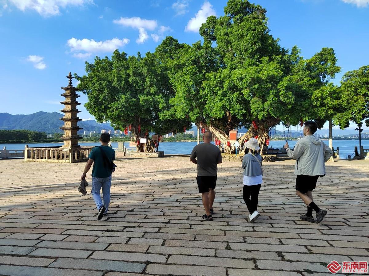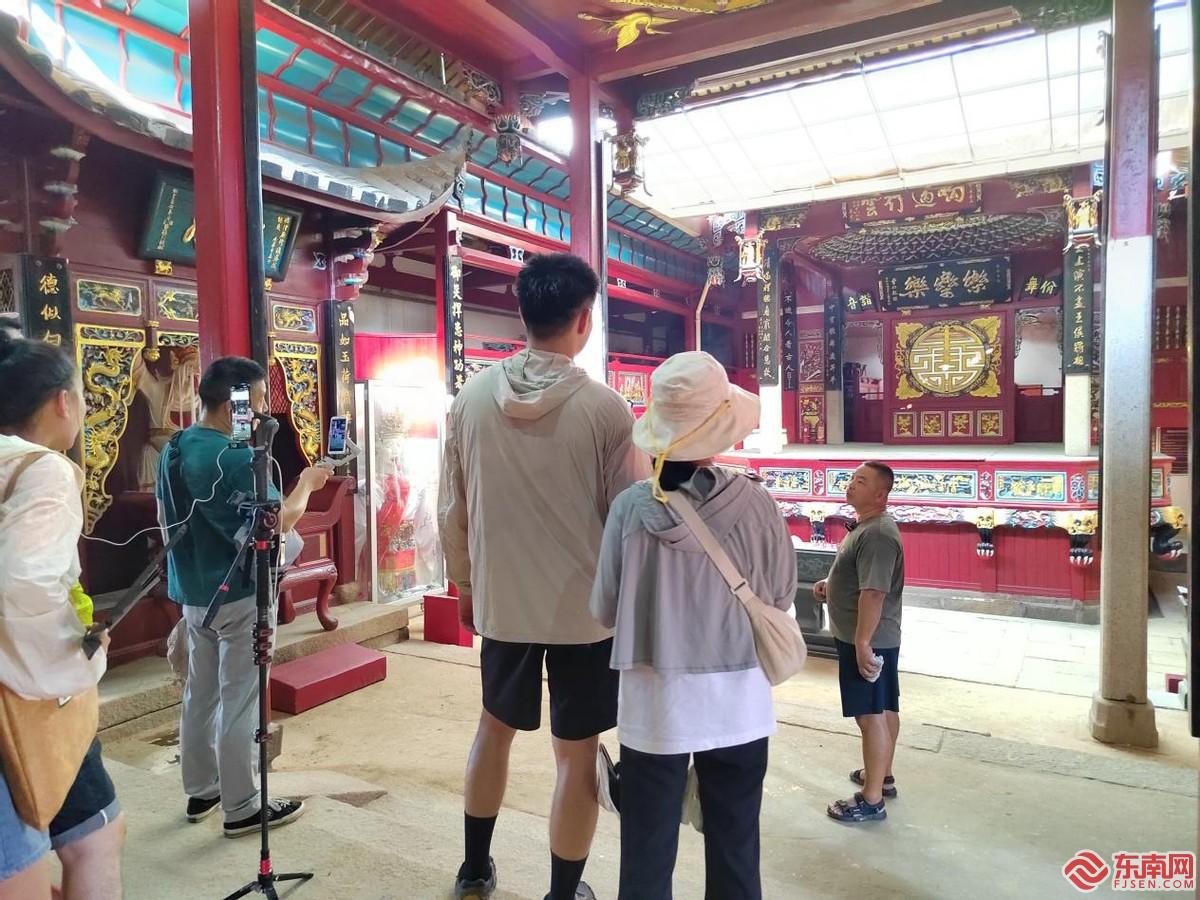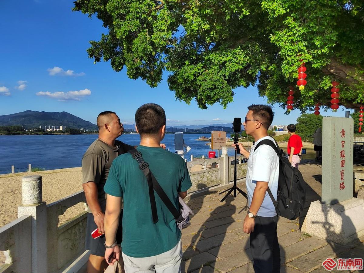 參觀侯官村城隍廟 侯官村內(nèi),有千年歷史的城隍廟,靜靜佇立在村頭。主播們踏著石階走進古廟,觸摸神秘古老的石柱,欣賞城隍廟里高懸于頭頂?shù)摹爸邑懖磺薄皥?zhí)法必嚴等木牌匾,深入了解古跡中的孝廉文化。 村內(nèi)的螺女廟和鎮(zhèn)國寶塔臨江而矗,同樣是侯官村的標(biāo)志性建筑。主播們在螺女廟聽侯官村黨委委員王國鋒講述“田螺姑娘”經(jīng)典民間傳說,在巨榕下打卡舊時為鎮(zhèn)水患依江而建的鎮(zhèn)國寶塔。