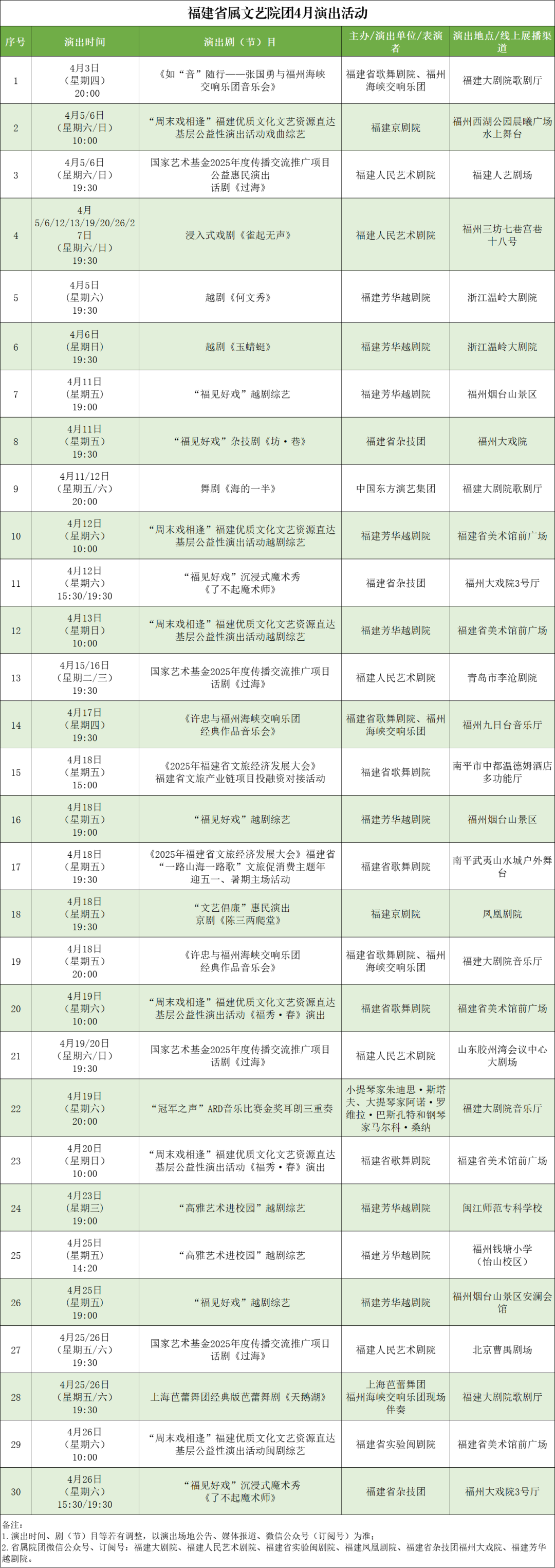 “周末戲相逢”福建優(yōu)質(zhì)文化文藝資源直達(dá)基層公益性演出活動(dòng) 戲曲綜藝 時(shí)間: 4月5、6日10:00 演出單位: 福建京劇院 越劇綜藝 時(shí)間: 4月12、13日 演出單位: 福建芳華越劇院 《福秀·春》 時(shí)間: 4月19、20日 演出單位: 福建省歌舞劇院 閩劇綜藝 時(shí)間: 4月26日 演出單位: 福建省實(shí)驗(yàn)閩劇院 地點(diǎn): 福州西湖