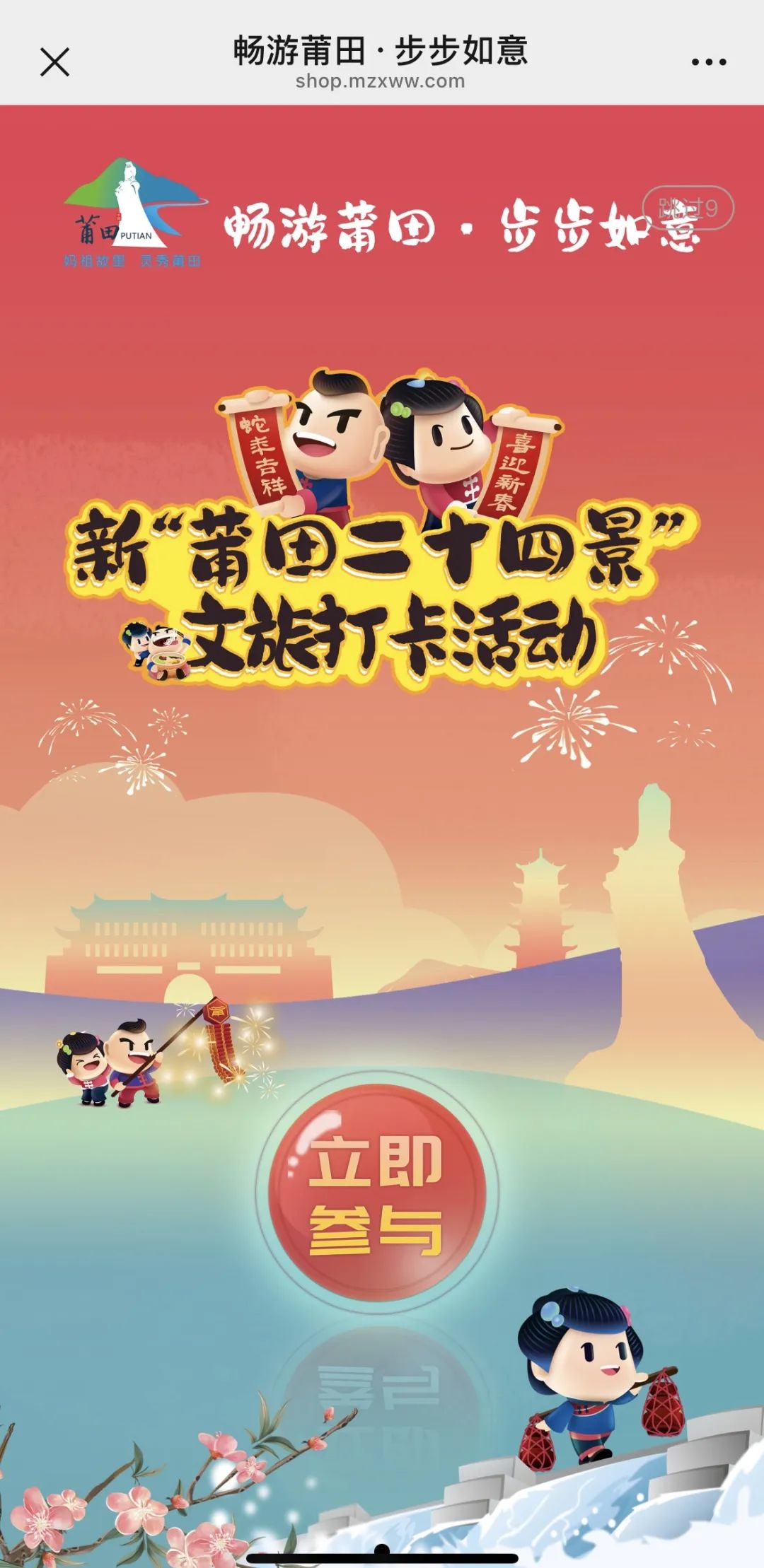 新“莆田二十四景”文旅打卡系列活動(dòng)暨“惠見(jiàn)莆田˙暢游國(guó)家歷史文化名城”文旅融合發(fā)展新業(yè)態(tài)消費(fèi)活動(dòng) 時(shí)間: 4月-獎(jiǎng)品送完即止 地點(diǎn): 莆田市