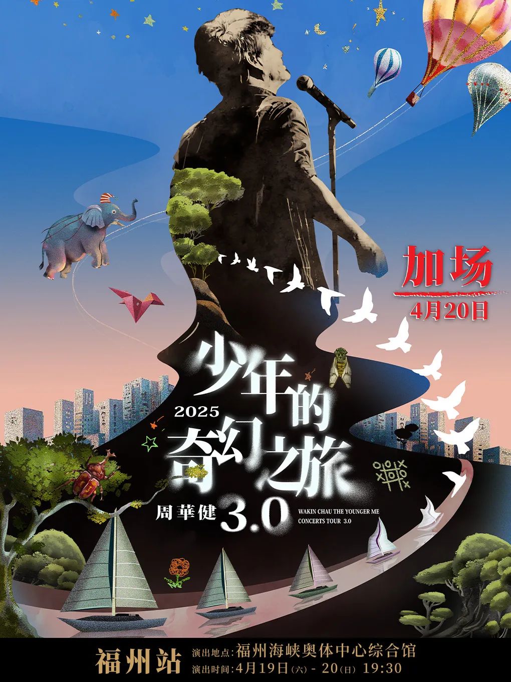2025 周華健 少年的奇幻之旅3.0巡回演唱會(huì)——福州站 時(shí)間: 4月19日、20日 19:30-22:30 地點(diǎn): 福州海峽奧林匹克體育中心綜合館 票價(jià): 499/699/899/1099/1299元 購(gòu)票渠道: 大麥、紛玩島、愛(ài)稻草票務(wù)、貓眼