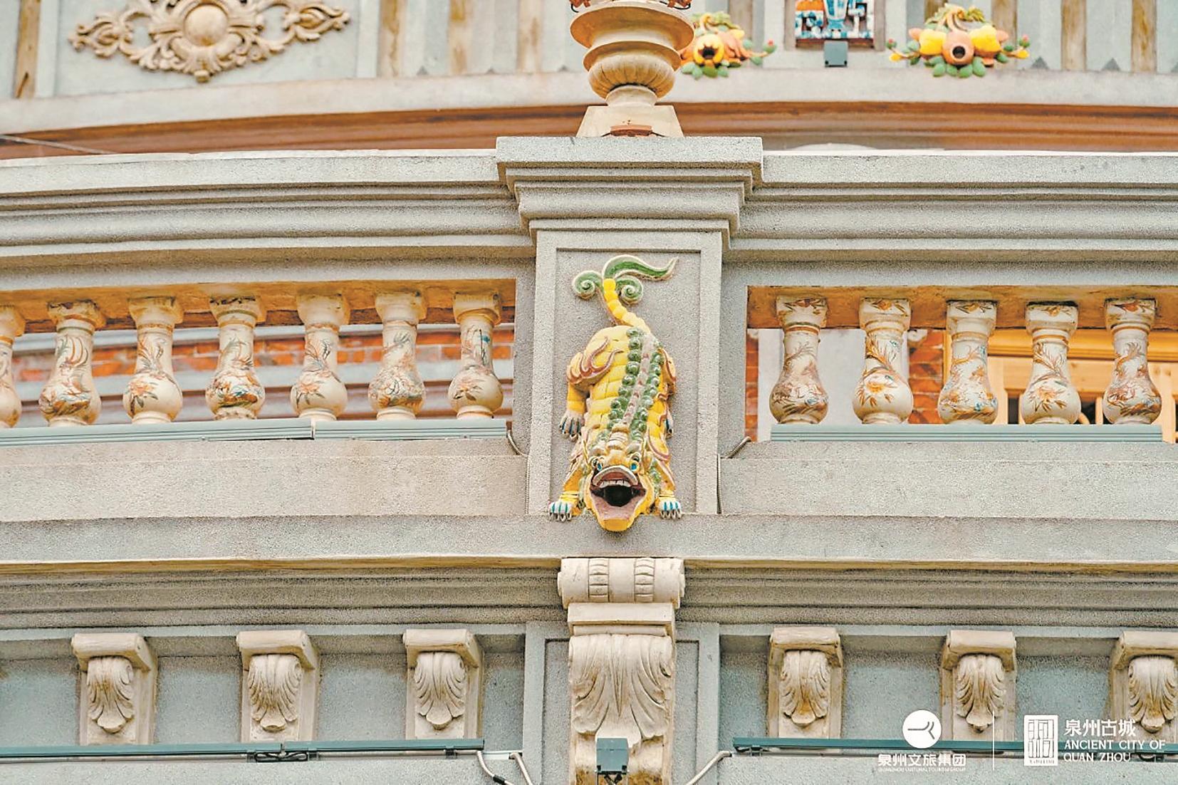 泉州人對(duì)生活的美好祈愿,醞釀出了豐富多彩的建筑表達(dá),而這一點(diǎn)也反應(yīng)在中山路灰塑的創(chuàng)作上。如麒麟、喜鵲、大象、獅子、飛馬、鳳凰、蝙蝠、松鶴、鯉魚、龍等,這些瑞獸祥圖寄托了人們對(duì)美好生活愿望。 灰塑包含畫與批兩類。畫稱為彩描,批稱為灰批。灰塑質(zhì)地潔白,以傳統(tǒng)建筑中的灰泥為主要材料?;夷嘤上枤せ遥ɑ蚴遥⒙榻z、煮熟的海帶,有時(shí)加入糯米漿、紅糖水,攪拌捶搗而成,增加其黏性。老祖宗用它造就了千百年的建筑藝術(shù)。