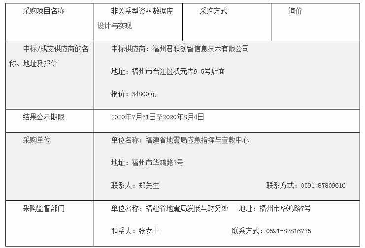 根據(jù)福建省地震局應(yīng)急指揮與宣教中心2020年7月21日公布的《非關(guān)系型資料數(shù)據(jù)庫(kù)設(shè)計(jì)與實(shí)現(xiàn)詢價(jià)公告》(http://www.fjdzj.gov.cn/ar/2020072114000011.htm),截止2020年7月28日18時(shí),共收到三家供應(yīng)商的響應(yīng)文件。2020年7月30日16時(shí),采購(gòu)詢價(jià)小組對(duì)上述三家供應(yīng)商進(jìn)行綜合評(píng)定,在滿足采購(gòu)文件實(shí)質(zhì)性響應(yīng)要求的基礎(chǔ)上,擬確定報(bào)價(jià)最低的“福州君聯(lián)創(chuàng)智信息技術(shù)有限公司”為成交供應(yīng)商。