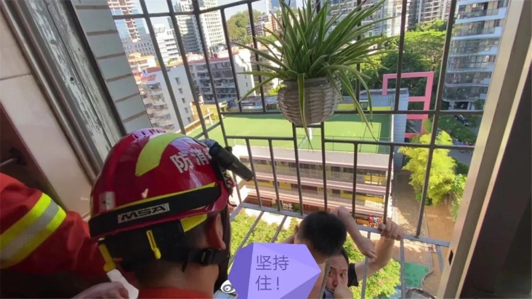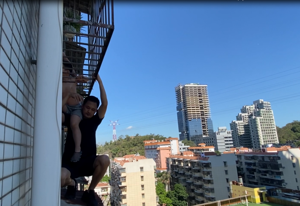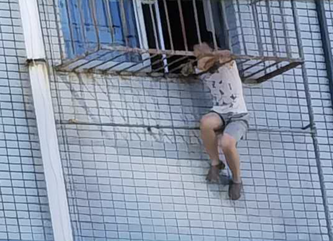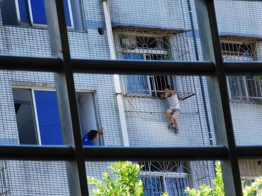 住在該小區(qū)七樓的戈志敏聽到窗外的呼喊,看到男孩正在痛哭掙扎,來不及多想就沖向五樓,在沒有任何防護(hù)的情況下,他一躍而上,翻出五樓轉(zhuǎn)臺(tái)窗外,腳踩四樓護(hù)欄頂部,在10米高樓外將孩子穩(wěn)穩(wěn)托起。 現(xiàn)場(chǎng)群眾拍攝的畫面 ▼