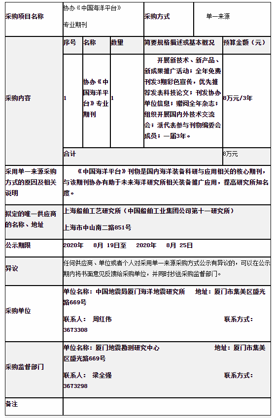 協(xié)辦《中國海洋平臺》專業(yè)期刊采用單一來源采購公示