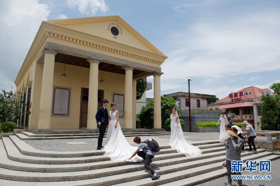 鼓浪嶼代表性歷史建筑協(xié)和禮拜堂前幾對(duì)情侶在拍攝婚紗照。新華社記者姜克紅攝 “鼓浪嶼:歷史國(guó)際社區(qū)”是中國(guó)一處獨(dú)特的、見證了中國(guó)在全球化發(fā)展早期階段實(shí)現(xiàn)現(xiàn)代化和中外多元文化交流與融合歷程的活態(tài)文化遺產(chǎn),反映出中國(guó)傳統(tǒng)文化深厚而堅(jiān)韌的文化根基和對(duì)世界不同文化、價(jià)值觀的包容、吸納與發(fā)展。