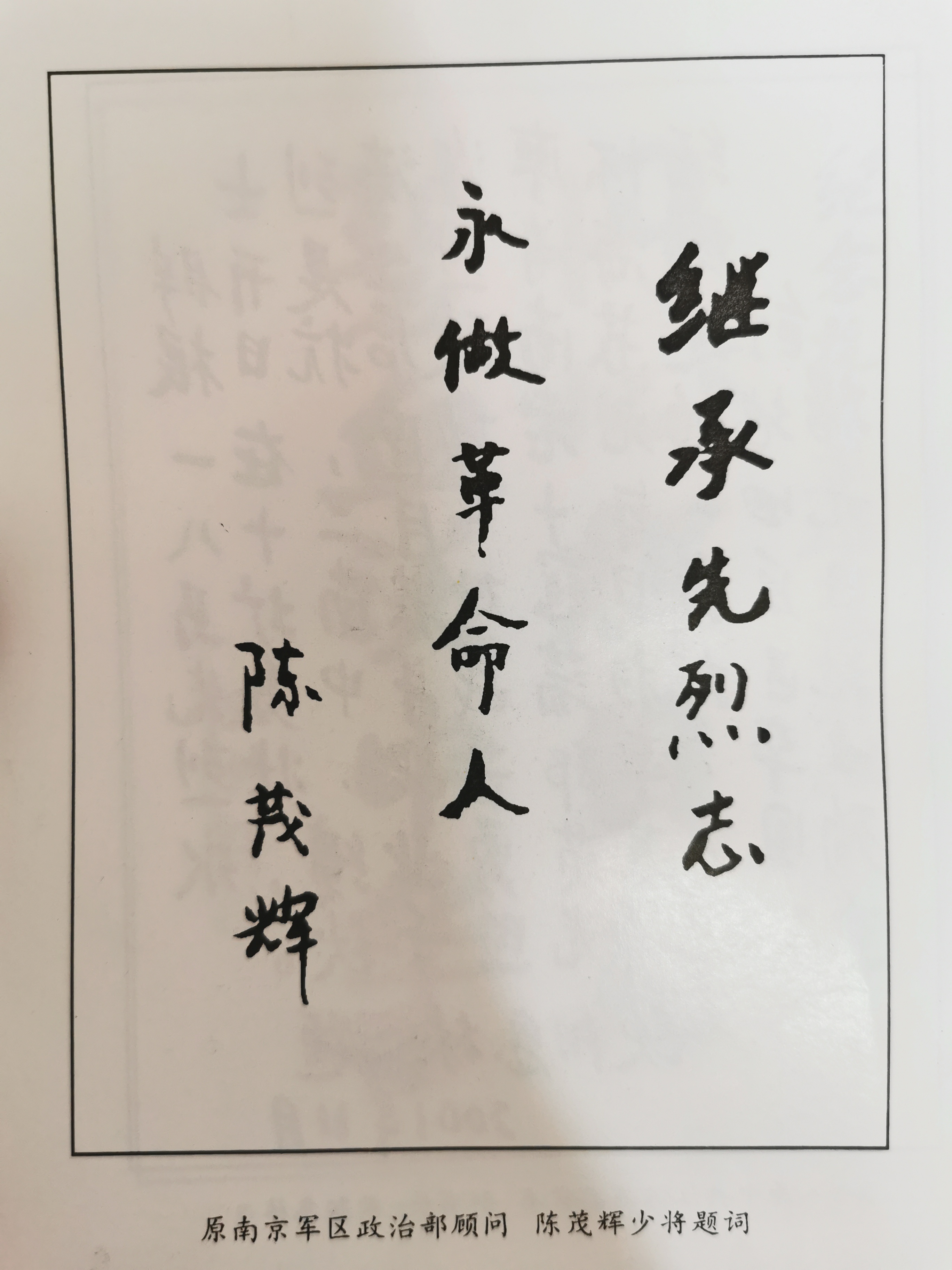 原南京軍區(qū)政治部顧問陳茂輝少將題詞:“繼承先烈志,永做革命人”。(圖片拍攝于廖海濤之女廖明娥所著:《抗日名將廖海濤》) 為表彰羅忠毅、廖海濤在三年游擊戰(zhàn)爭、抗日戰(zhàn)爭中的突出貢獻(xiàn),2009年,在新中國成立60周年之際,羅忠毅被評選為“100位為新中國成立作出突出貢獻(xiàn)的英雄模范人物”之一。而廖海濤,也在2014年入選國家第一批300名著名的抗日英烈。 |