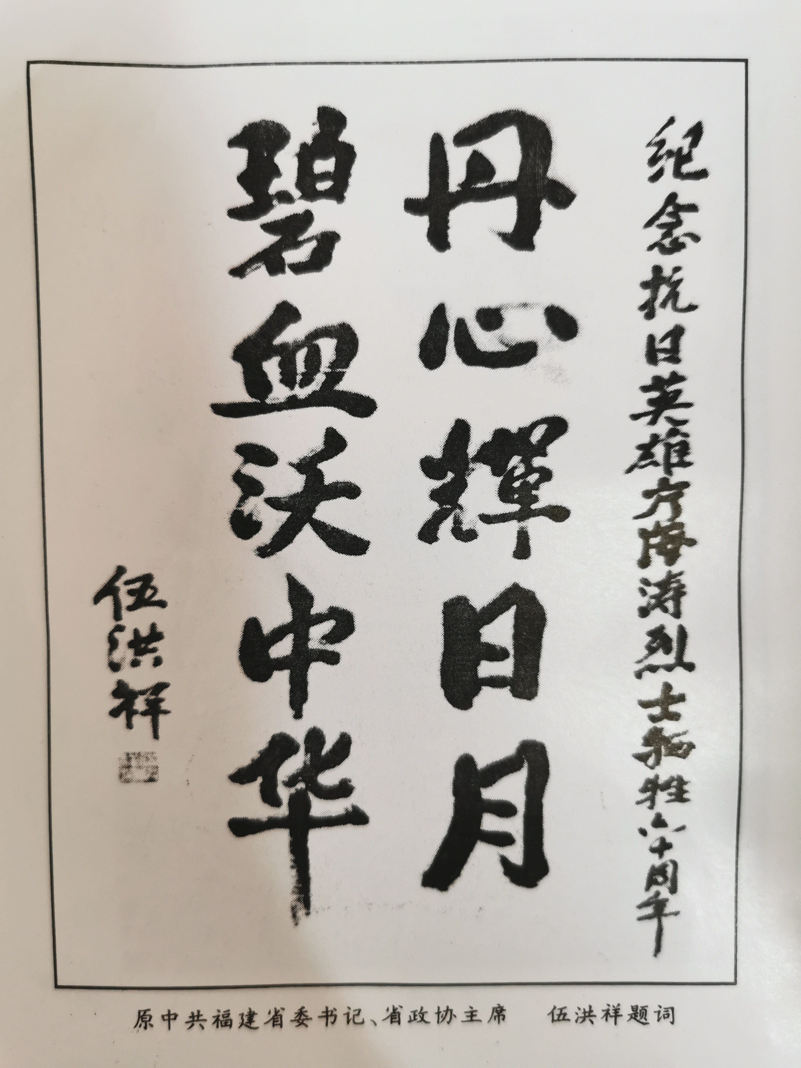 原中共福建省委書記、省政協(xié)主席伍洪祥題詞:“丹心輝日月,碧血沃中華”。(圖片拍攝于廖海濤之女廖明娥所著:《抗日名將廖海濤》) 羅忠毅、廖海濤犧牲后,日本侵略者為羅、廖兩位同志的壯烈精神所感動,洗凈二人尸體上的血跡,用當(dāng)?shù)刈詈玫拈竟撞氖咳朐?。他們同樣像抗日名將楊靖宇、張自忠將軍一樣,獲得敵人的尊重和佩服。