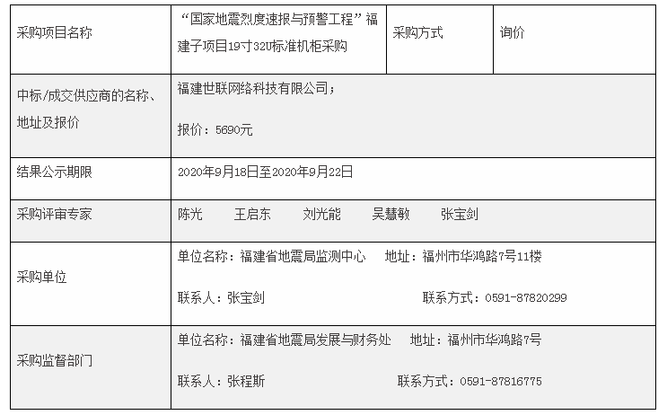 監(jiān)測中心國家地震烈度速報(bào)與預(yù)警工程福建子項(xiàng)目標(biāo)準(zhǔn)機(jī)柜采購結(jié)果公示