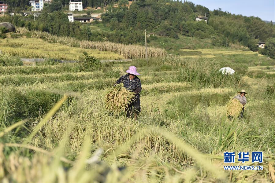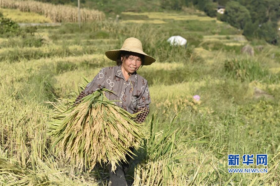 10月2日,福建省三明市尤溪縣聯(lián)合鎮(zhèn)東邊村村民在聯(lián)合梯田上搬運(yùn)稻谷。新華社記者 林超 攝