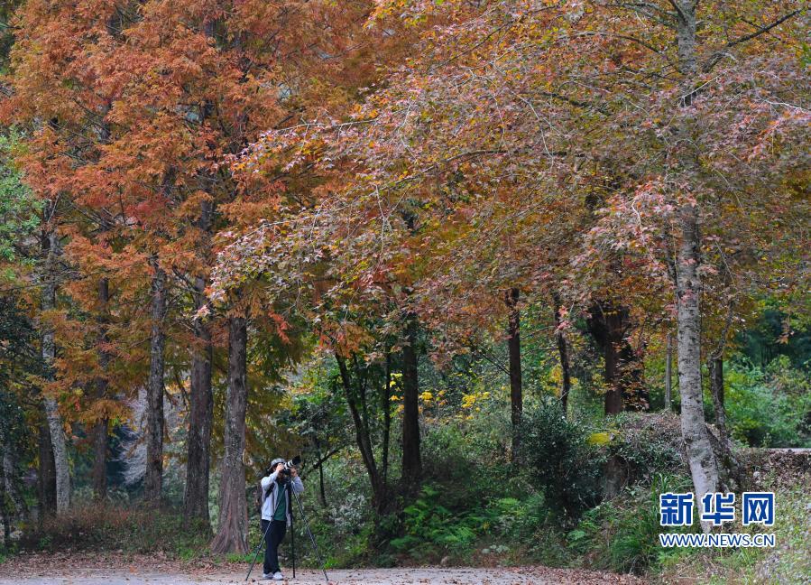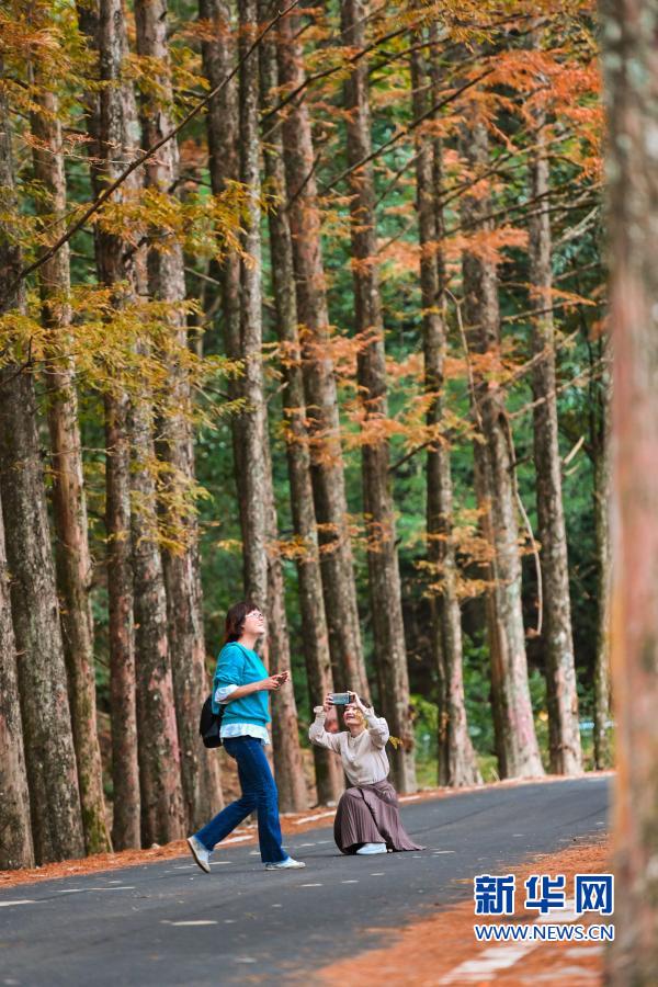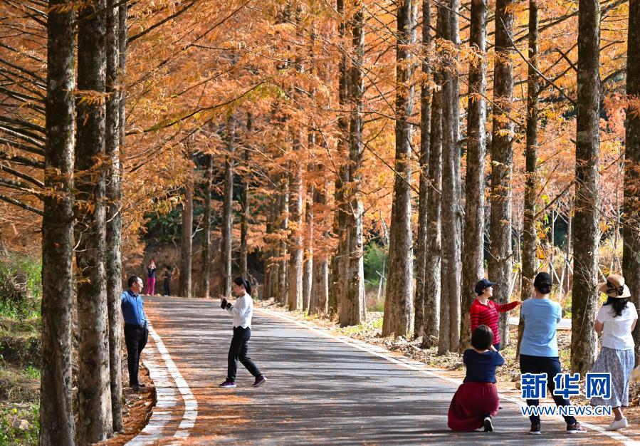 11月19日,游客在福建省三明市將樂縣國(guó)家級(jí)自然保護(hù)區(qū)水杉大道游覽。新華社記者 宋為偉 攝