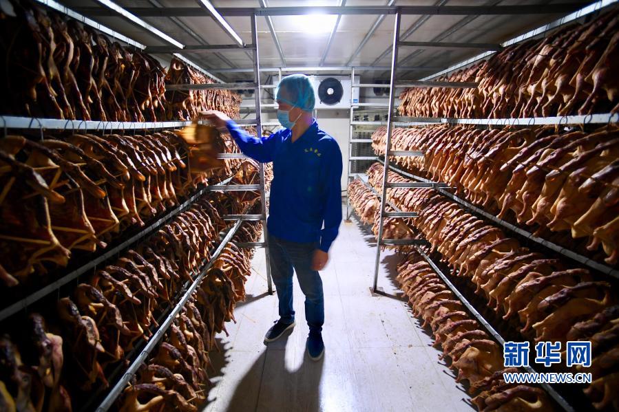 11月18日,沙縣小吃產(chǎn)業(yè)園一家企業(yè)工作人員查看庫房中的熏鴨。新華社記者 姜克紅 攝