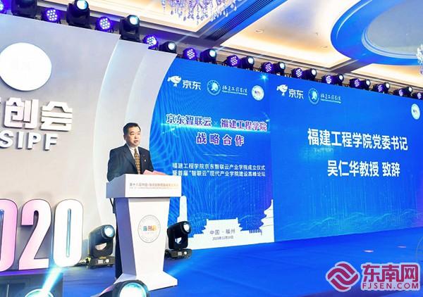 吳仁華致辭。東南網(wǎng)記者 陳楠 攝 東南網(wǎng)12月10日訊(本網(wǎng)記者 陳楠)今天上午,作為第十八屆“海創(chuàng)會”配套活動的福建工程學(xué)院京東智聯(lián)云產(chǎn)業(yè)學(xué)院成立儀式暨首屆“智聯(lián)云”現(xiàn)代產(chǎn)業(yè)學(xué)院建設(shè)高峰論壇在福州市開幕。 記者在會上獲悉,此次雙方聯(lián)合成立的福建工程學(xué)院京東智聯(lián)云產(chǎn)業(yè)學(xué)院將致力于開展產(chǎn)教融合創(chuàng)新示范,在電商、貿(mào)易、物流供應(yīng)鏈、人工智能等領(lǐng)域建立長效穩(wěn)固的合作機制,加快福建省該領(lǐng)域應(yīng)用型人才培養(yǎng)。學(xué)院依托于互聯(lián)網(wǎng)經(jīng)貿(mào)學(xué)院,開設(shè)電子商務(wù)行業(yè)工程師實驗班,并整合線下線上教學(xué)資源等多種教學(xué)模式。目前學(xué)院現(xiàn)有富民云咖新媒體產(chǎn)教融合基地、互聯(lián)網(wǎng)創(chuàng)客中心等校內(nèi)實踐平臺,以及可利用的京東(福清)電商產(chǎn)業(yè)園、京東(仙游)數(shù)字經(jīng)濟產(chǎn)業(yè)園、京東(廈門)電子商務(wù)產(chǎn)業(yè)園等多個省內(nèi)實踐平臺,引入產(chǎn)業(yè)知識與技能入課堂,打造理論與實踐無縫對接的學(xué)習(xí)模式。