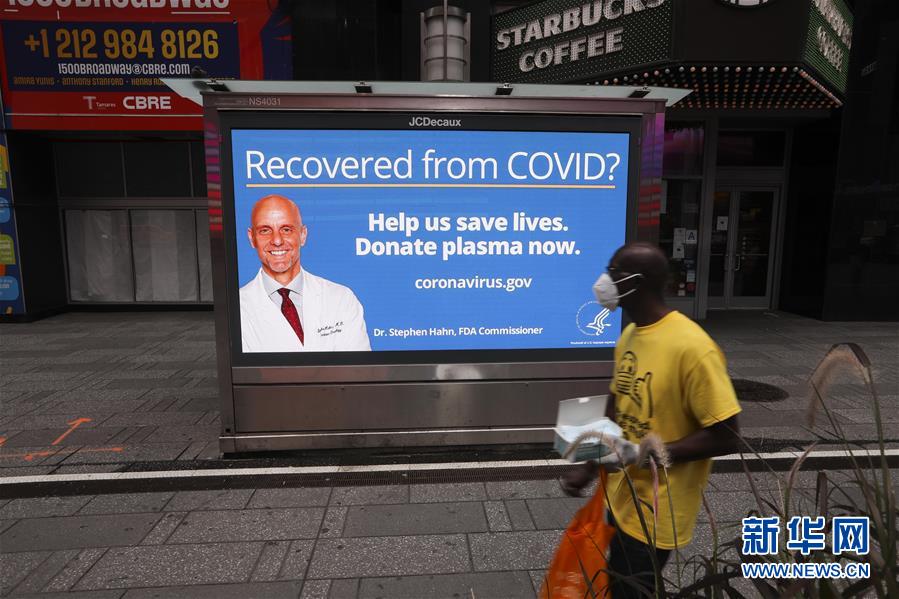 8月19日,在美國紐約,一名行人從號召新冠康復(fù)者捐獻(xiàn)血漿的廣告牌旁走過。 新華社記者 王迎 攝