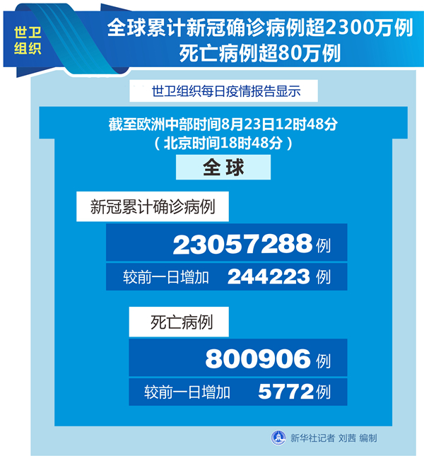 世衛(wèi)組織:全球累計(jì)新冠確診病例超2300萬(wàn)例 死亡病例超80萬(wàn)例