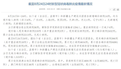 人民網北京8月25日電(董童)國家衛(wèi)生健康委于今日在官網發(fā)布的《截至8月24日24時新型冠狀病毒肺炎疫情最新情況》(以下簡稱“情況”)提出,8月24日0—24時,31個?。ㄗ灾螀^(qū)、直轄市)和新疆生產建設兵團報告新增確診病例14例,均為境外輸入病例(四川4例,廣東3例,上海2例,陜西2例,天津1例,河北1例,遼寧1例);無新增死亡病例;無新增疑似病例。當日新增治愈出院病例36例,解除醫(yī)學觀察的密切接觸者1294人,重癥病例較前一日減少4例。