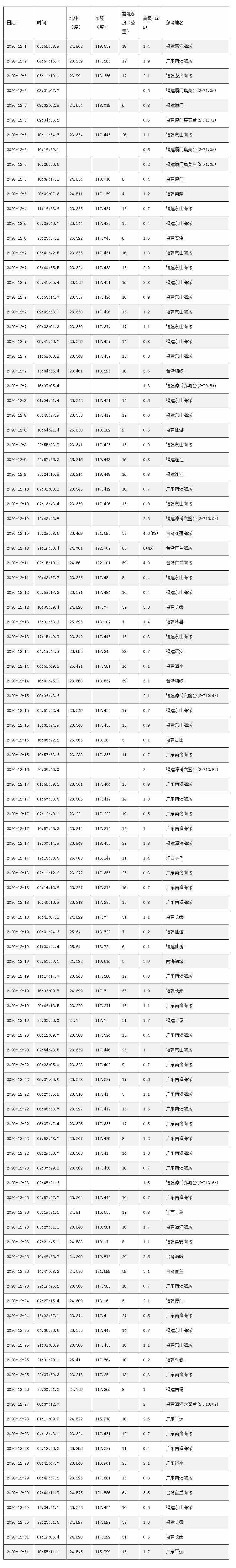 2020年12月福建及周邊地區(qū)地震目錄