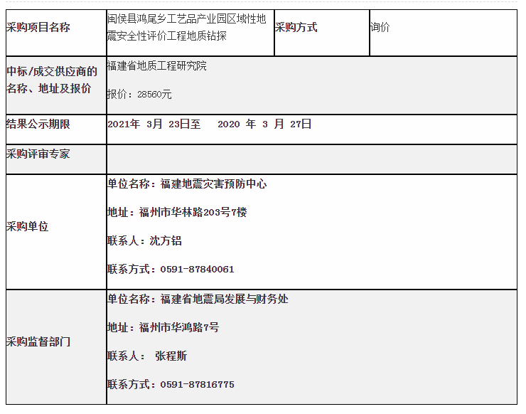 福建地震災(zāi)害預(yù)防中心2021年閩侯縣鴻尾鄉(xiāng)工藝品產(chǎn)業(yè)園區(qū)域性地震安全性評價(jià)工程地質(zhì)鉆探采購結(jié)果公示