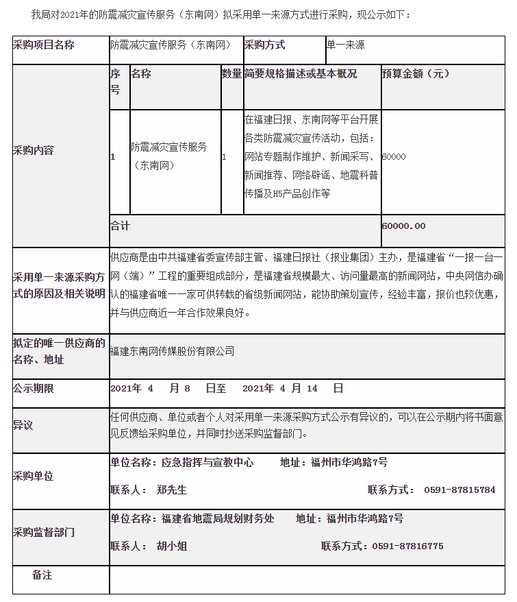 應(yīng)急指揮與宣教中心防震減災(zāi)宣傳服務(wù)(東南網(wǎng))采購公示