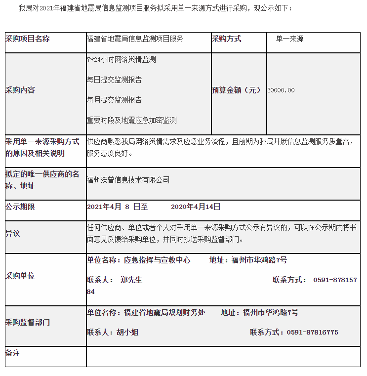 應(yīng)急指揮與宣教中心福建省地震局信息監(jiān)測(cè)項(xiàng)目服務(wù)采購公示
