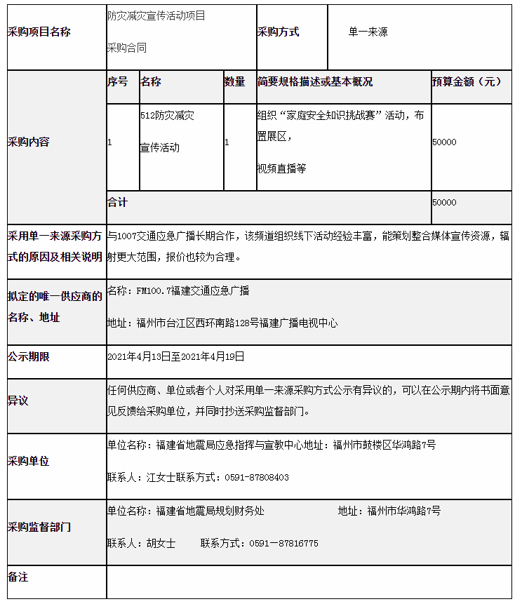 應(yīng)急指揮與宣教中心防災(zāi)減災(zāi)宣傳活動(dòng)項(xiàng)目單一來(lái)源采購(gòu)公示