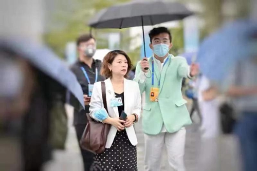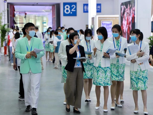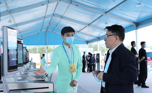 看!再往里面走一點,在展館入口的閘機(jī)處,“小茉莉”們指引前來參展的嘉賓和觀眾有序經(jīng)過閘機(jī),進(jìn)行體溫測量、人臉識別。 新聞中心志愿者